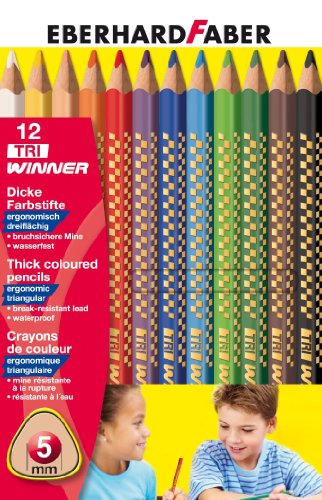 Eberhard Faber 518412 EFA Tri Winner Dickkern-Buntstifte 12 er-Etui - Dicke Farbstifte im ergonomischen Dreikant-Format mit rutschfester Griffzone - Dreikantstift - Intensiver, weicher Farbabstrich - Bruchfeste Mine - Schaft in Farbe der Mine lackiert - Guter Halt durch Griffprägung - Leicht spitzbar - Dickkern-Farbstift: Minen-Ø 5mm - Stift-Länge 17,5 cm - Inhalt: 12 Stifte / 12 Farben Lieferumfang: Eberhard Faber Farbstifte Tri Winner Dreikant, 1 Kartonetui mit 12 Farben Hersteller: Eberhard Faber Hersteller-Nr.: EFA 518412