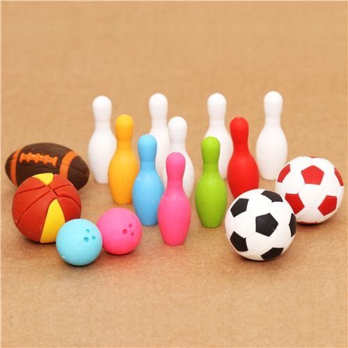 Iwako Radiergummi-Set Sports. süßes Radiergummi-Set mit bunten & weißen Bowling Kegeln, Bowling Kugel, American Football, Basketball & Fußball